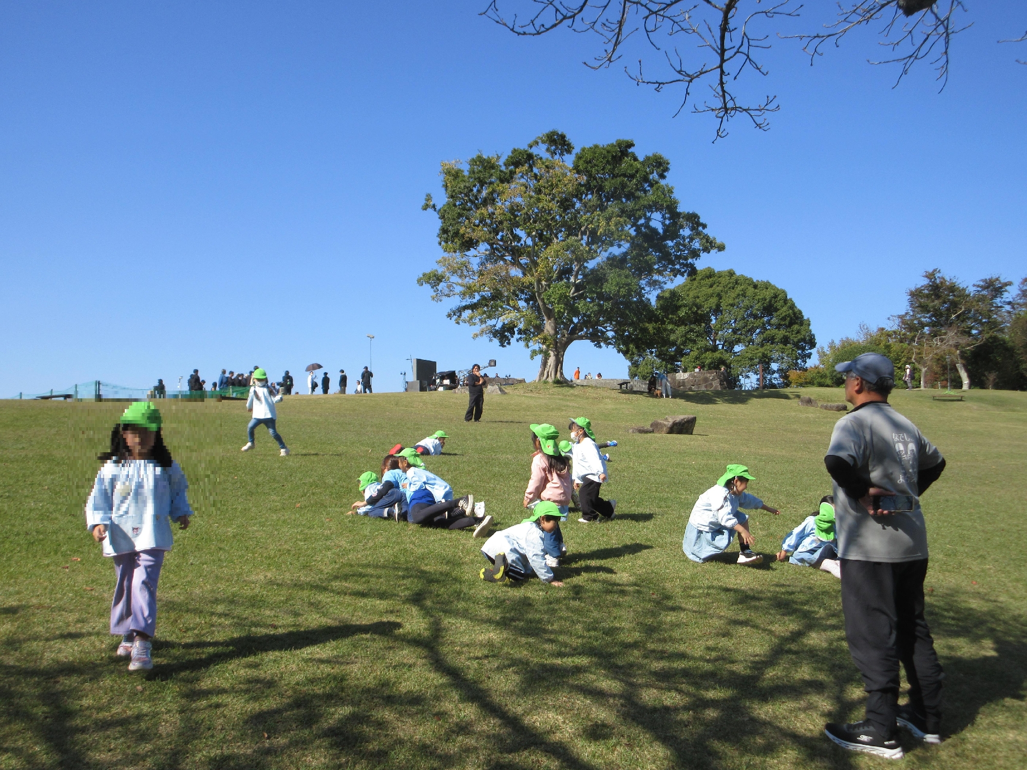 芝生の坂があれば、転がりたくなるのが子どもです。頭も洋服も芝だらけになって遊ぶ子どもたちでした。