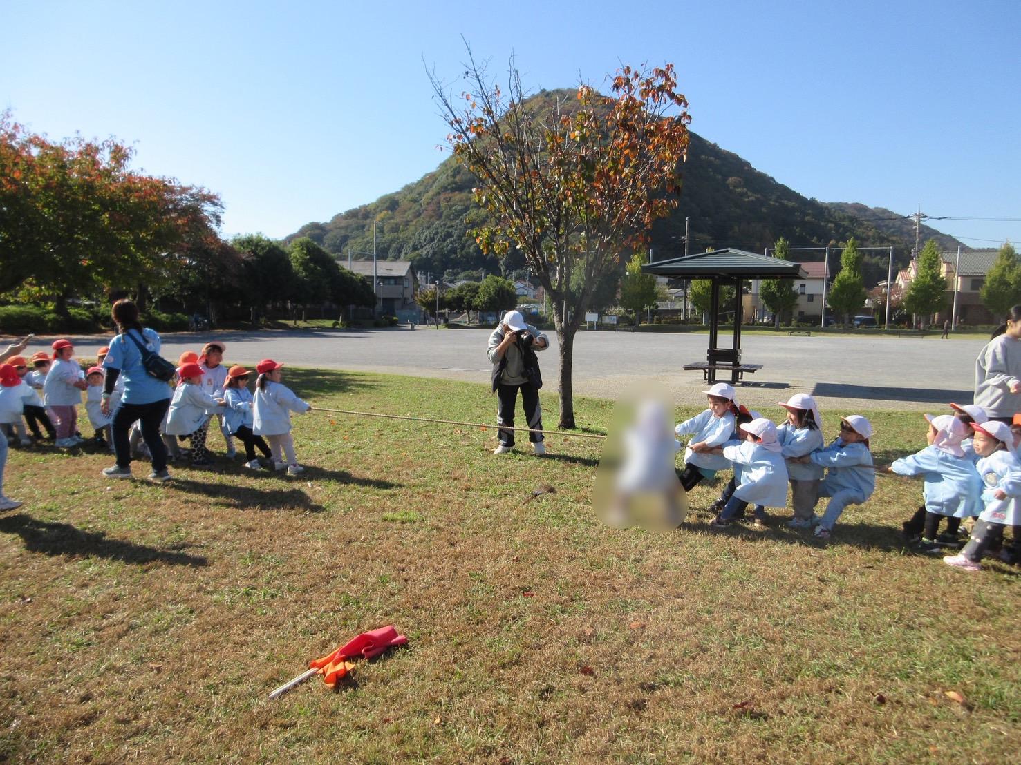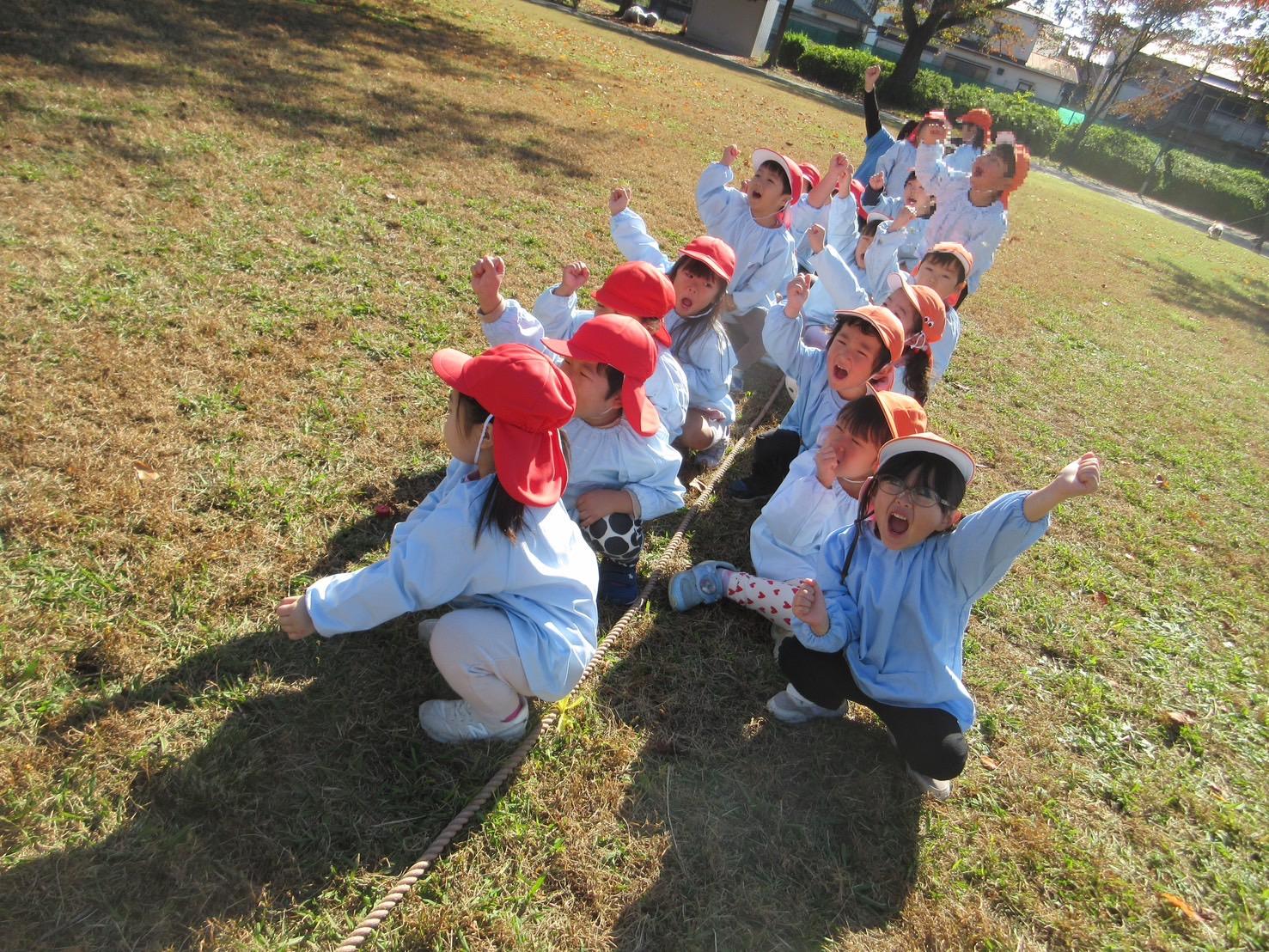 なでしこの屋外でのレクリエーションといえば、綱引き 年中少がカラー城に分かれて対戦です。