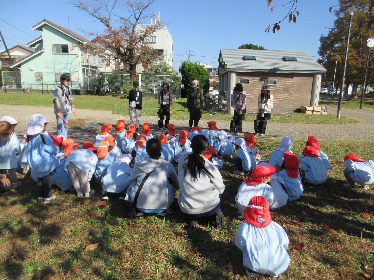 集合写真を撮って、クラスごとに公園のお約束の確認です。丘がある桜ヶ丘公園ですが、丘の反対側は先生たちの目が届かないので、行ってはいけないお約束になっています。