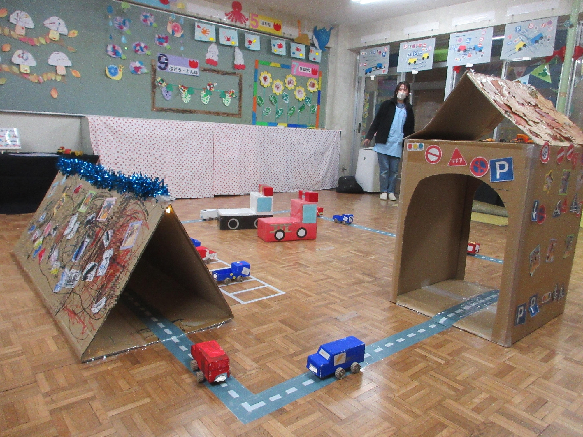 でも、なでしこの先生はそれで終わりではありません。子どもたちが楽しく遊べるように、お部屋に道路やトンネルも作ってくださいました。大人だってわくわくしてしまう空間ですよね😊