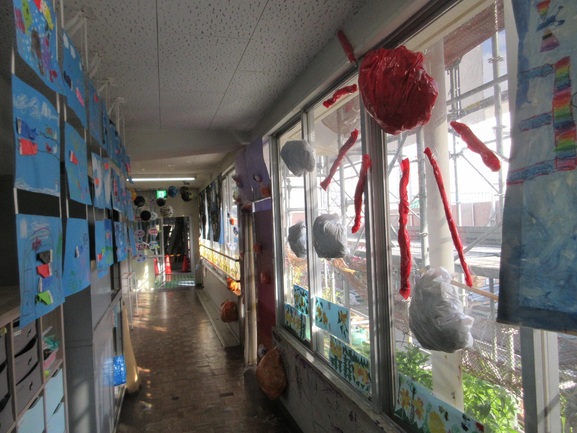 毎年年長組の共同制作は、ホールに展示されるのが習わしですが、今年はホールが使用できないため、廊下を使っての展示に切り替え、細長い環境を活かした展示を完成させてくれたきく組さん。