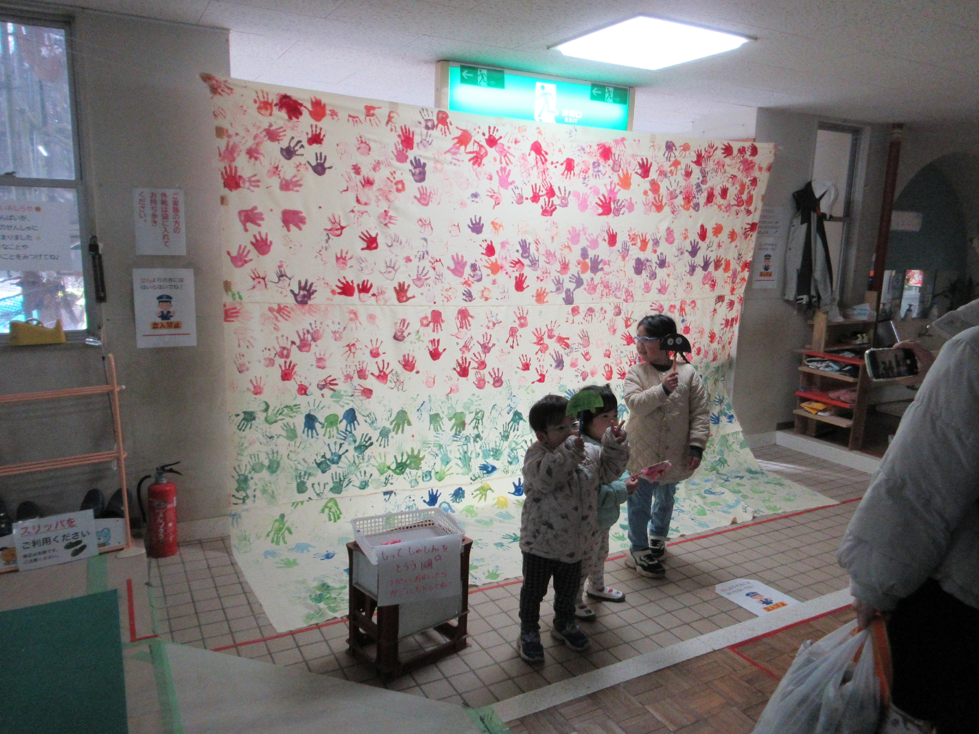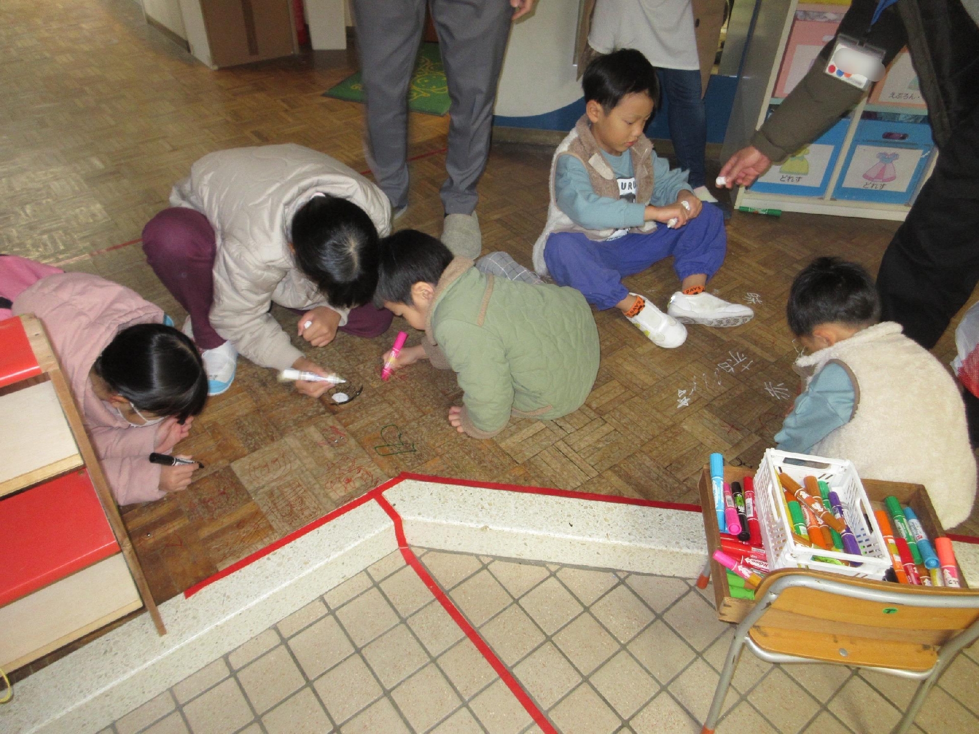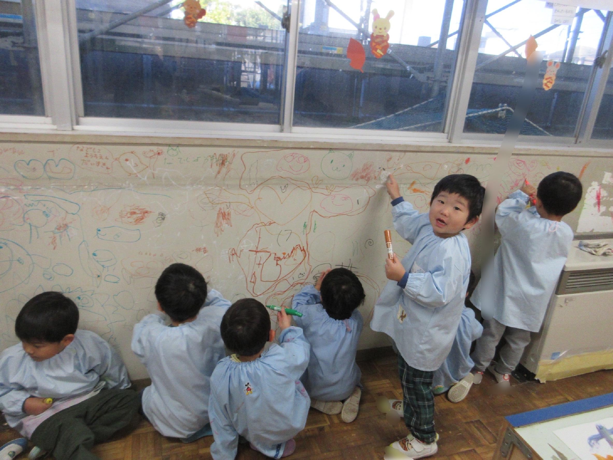 最後の造形まつりとなる年長さん。最後まで床や壁におえかきを楽しんでくれていました。いつまでも子どもたちの記憶に残ってくれることを願っています。