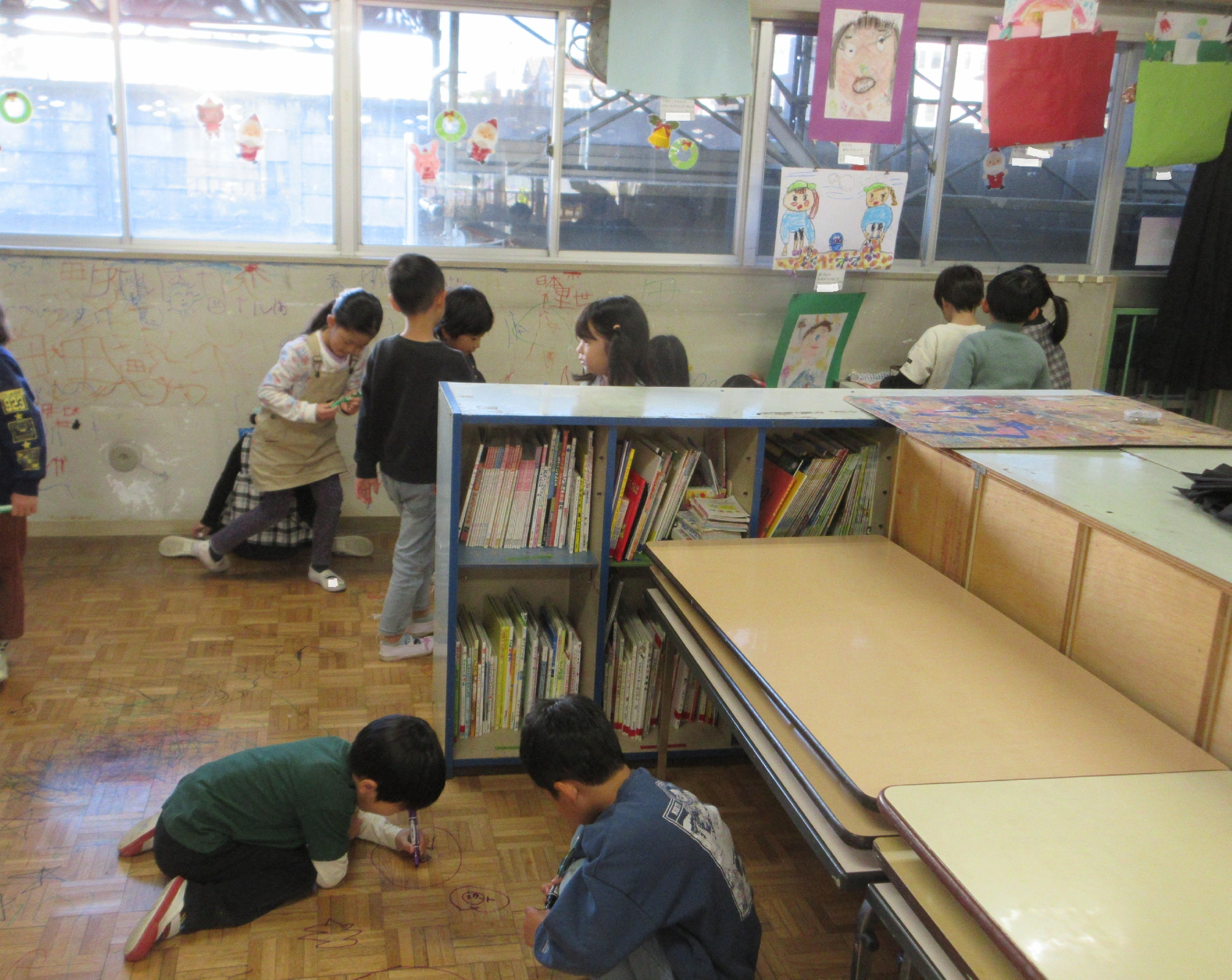 造形まつりの前日、ロッカーを移動した壁に、思い思いにおえかきをする子どもたちの姿が…