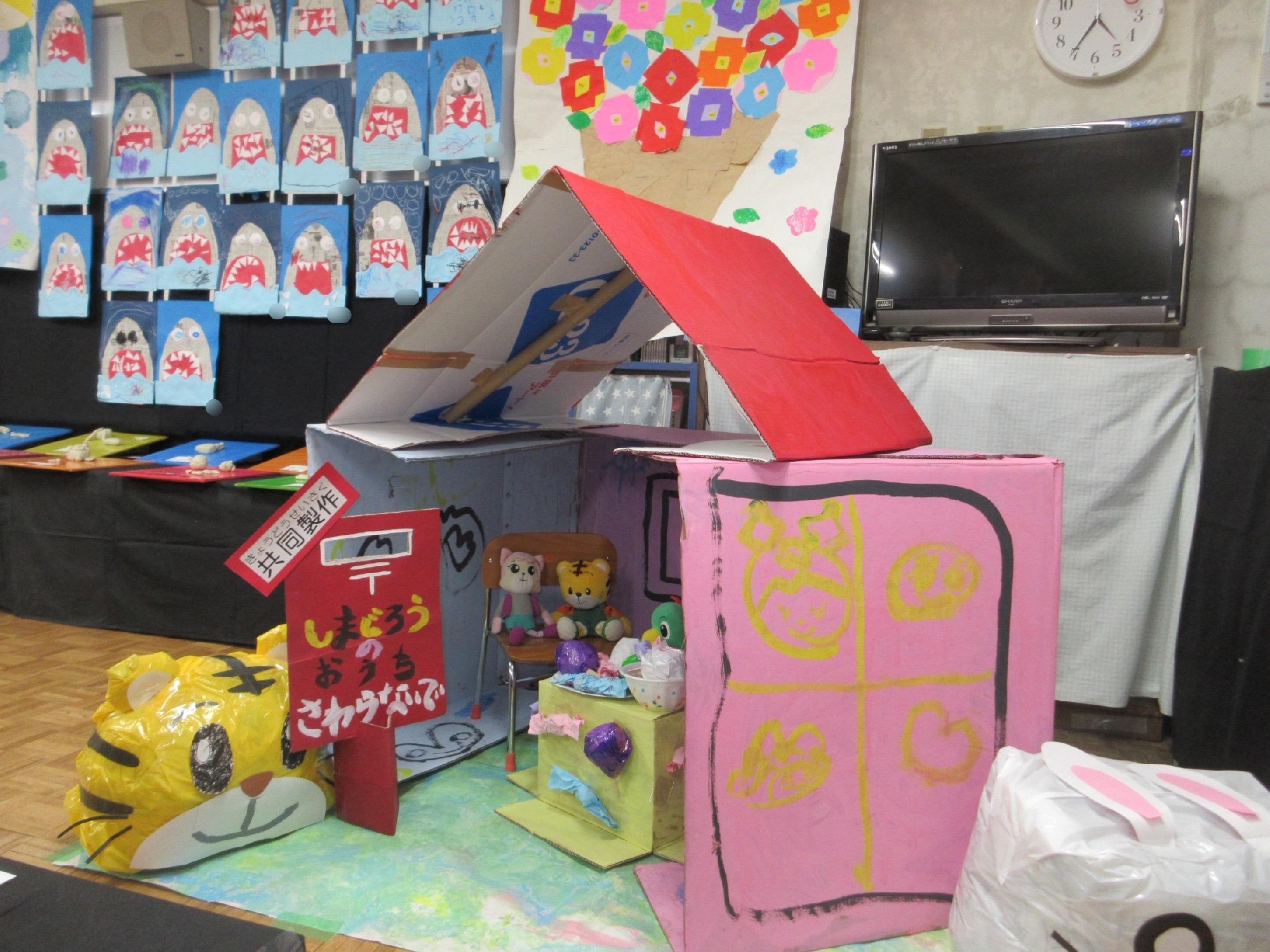 大きな段ボールにみんなで色を塗ったり、小さなしまじろうを作ったり、お友達と協力して、素敵なしまじろうのおうちが完成しました。